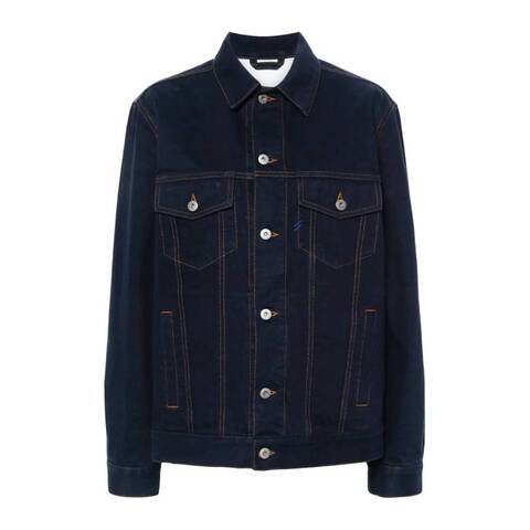 Burberry Ladies Outerwear. Fashion category: Coats & Jackets. SKU: 8080769. Color: Indigo Blue. Burberry Womens Indigo Blue Logo-Patch Denim Jacket. A denim jacket with a logo patch on the back and an internal signature Equestrian Knight print. It features a classic collar, long sleeves with buttoned cuffs, and a straight hem. Functional details include two chest flap pockets, two side welt pockets, partial lining, and a front button fastening for a timeless, versatile look. Material: Cotton 100%, Bos Taurus 100% Made in Italy.