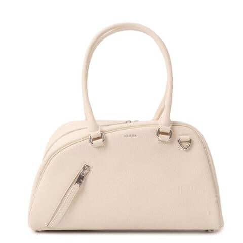 Burberry Ladies Bowling Bag. SKU: 8102180. Barcode: 5045708237858. Color: Soap. Size: 12.6 x 4.9 x 7.7 in. Burberry Small Shield Twin Bowling Bag In Soap. This bag is an Italian-crafted design rendered in textured, grainy calf leather in a soft, light beige-grey Soap hue. Defined by its structured, shield-inspired silhouette, the bag reinterprets the classic bowler style with a contemporary edge. It features rolled top handles, a two-way zip closure, and signature gold-tone hardware. Practical details include an exterior zip pocket, an interior slip pocket, and a generously sized main compartment for everyday essentials.