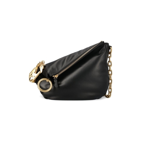 Burberry Ladies Shoulder Bag. SKU: 8082384. Color: Black. Size: L: 9.5 x H: 3.2 x W: 9.1. Burberry Small Knight Chain-linked Puffy Shoulder Bag. This bag is crafted from puffy nappa leather with a smooth leather lining. The clip hardware, inspired by the Equestrian Knight Design, complements its adjustable chain strap. It also features a zip closure, hand-painted edges, and brushed metal hardware. Material: 100% Lambskin. Made in Italy.