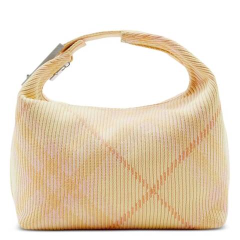 Burberry Ladies Top Handle Bag. SKU: 8082046. Color: Sherbet. Size: 11 x 6.5 x 13.2in. Burberry Medium Peg Duffle Bag. This softly structured bag is knitted in Italy with the iconic Burberry Check and designed in a lightweight, unlined construction. The curved top handle is secured with a logo-engraved peg clip, adding a refined signature detail. Finished with a secure zip-top closure and a single top handle, the bag offers a polished yet practical design ideal for everyday or professional use. 100% polyamide. Trim: 57% polyester, 43% polyurethane. Made in Italy.