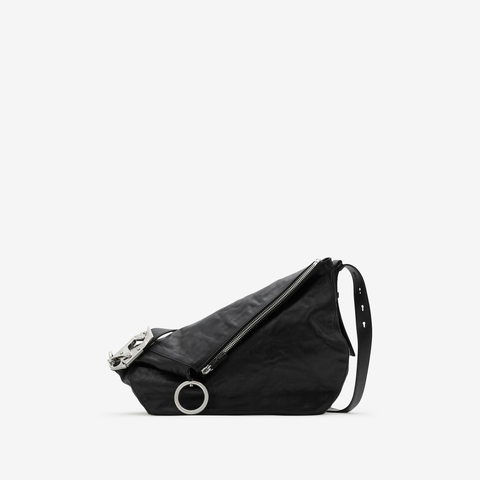 Burberry Ladies Shoulder Bag. SKU: 8078773. Color: Black. Size: L: 14.56 x H: 11.41 x W: 5.11. Burberry Medium Knight Leather Shoulder Bag. This shoulder bag is crafted from smooth grain black calf leather and features a folded design with a striking horse motif. It is accented with silver-tone hardware and a top zip fastening for secure closure. The adjustable, detachable shoulder strap offers versatile styling, while the interior includes a slip pocket and luxurious suede lining. Material: 100% Calf Leather. Made in Italy.