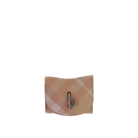 Burberry Ladies Wallets. SKU: 8081785. Color: Peach. Size: L: 4.5 x H: 1.2 x W: 4.1. Burberry Rocking Horse Wool Blend Wallet. This wallet features the iconic Burberry Check in an Italian-woven wool blend, secured with a B closure at the flap. Its curved shape is inspired by the nostalgic design of childhood rocking horses. Material: 66% Polyester, 34% Wool. Made in Italy.