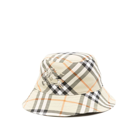 Burberry Mens Hats. Fashion category: Hats. SKU: 8094798. Material: Polyester. Color: Light Sage Ip Check. Burberry EKD Motif Vintage-Check Bucket Hat. This bucket hat is made from a recycled polyester blend, featuring a Vintage Check pattern and the signature Equestrian Knight motif, with a dropped narrow brim and an unlined design. 100% Polyester. Made in Italy.