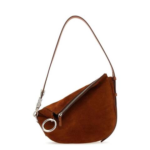 Burberry Ladies Tote. SKU: 8075192. Barcode: 5045704314850. Color: Bruciato. Size: 13.6 x 3.4 x 9.1in. Burberry Small Knight Zipped Shoulder Bag. A suede shoulder bag defined by its modern asymmetric silhouette and sleek silver-tone hardware. Crafted from soft suede with tonal stitching, it features an adjustable shoulder strap for a customized fit and a secure top zip fastening. The spacious main interior compartment offers practical storage, while the refined metal detailing adds a subtle, contemporary edge. Material: 100% calf suede. Made In Italy.