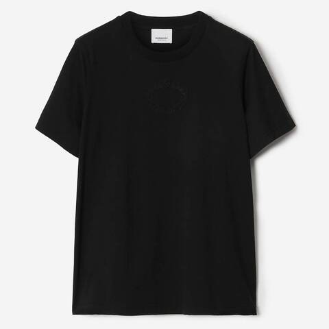 Burberry Ladies Tops. Fashion category: T-Shirts & Henleys. SKU: 8069108. Color: Black. Burberry Margot Crest Embroidered Cotton T-Shirt. This T-shirt features an embroidered logo on the front, a crew neck, short sleeves, and a straight hem. 100% Cotton. Made in Portugal.