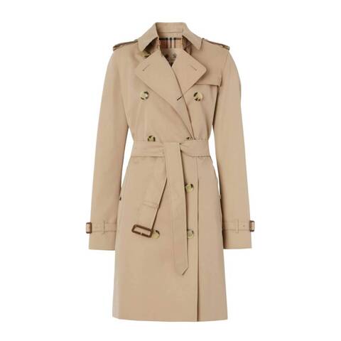 Burberry Ladies Outerwear. Fashion category: Coats & Jackets. SKU: 8058028. Color: Honey. Burberry The Kensington Mid-Length Trench Coat. This trench coat is made from cotton and boasts a classic collar, epaulettes, and a double-breasted button closure. It features long sleeves with belted cuffs, a belted waist for a fitted look, two side slit pockets, and a stylish mid-length design. Material: 100% Cotton. Made in United Kingdom.