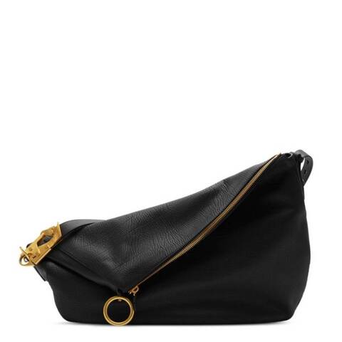 Burberry Ladies Tote. SKU: 8077550. Barcode: 5045704358533. Color: Black. Size: 21.6 x 5.3 x 19.2in. Burberry Black Ladies Large Knight Bag. This softly structured bag, crafted in Italy from natural grain calf leather and lined with supple suede, showcases a versatile design inspired by the Equestrian Knight motif. Its distinctive clip hardware allows the shape to be transformed from a shoulder bag to a tote, while details like hand-painted edges, brushed metal hardware, and a secure zip closure highlight its craftsmanship. An adjustable leather strap adds further versatility, making it both elegant and functional. Material: 100% calf leather. Made in Italy.