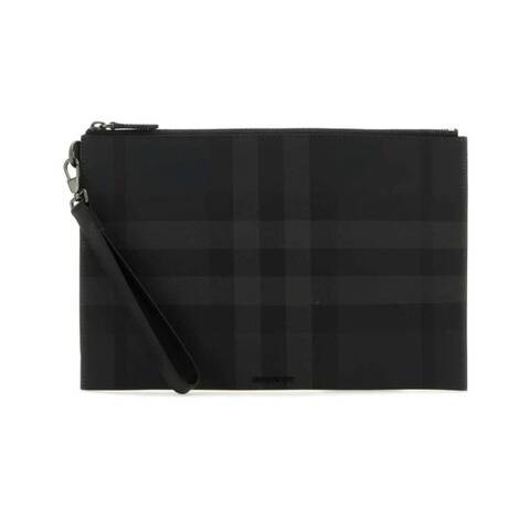Burberry Mens Clutch. SKU: 8074693. Size: L: 11.81 x H: 7.87 x W: 0.39. Burberry Check Pattern Coated Canvas Clutch. This clutch is crafted from coated canvas with a check motif and features a zip closure. It includes a removable leather handle, six internal compartments for credit cards, and one internal pocket for added convenience. Material: 70% Termoplastic Polyurethane, 30% Cotton.