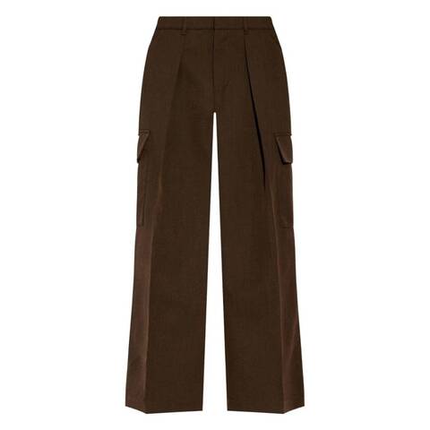 Burberry Ladies Bottoms. Fashion category: Pants & Leggings. SKU: 8094945. Color: Brown/Black. Burberry Wide-Leg Pleated Cargo Trousers. These wool cargo trousers are tailored with pleat detailing and a high-waisted silhouette for a refined yet contemporary look. Designed with a concealed front fastening and belt loops, they feature two side cargo pockets, two side inset pockets, and two rear welt pockets for added functionality. A pressed crease and wide-leg cut complete the design, offering a sharp, structured finish. Outer: Wool 100%.