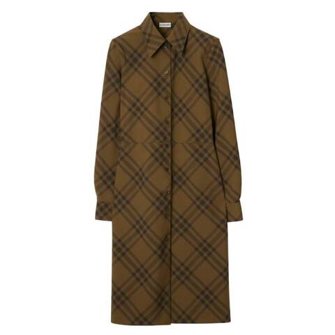 Burberry Ladies Dresses. Fashion category: Casual Dresses. SKU: 8097563. Color: Camp Ip Check. Burberry Check Wool Blend Shirt Dress. This shirt dress is crafted from an Italian-woven wool blend and patterned with a seasonal check for a refined, timeless look. Cut to a slim fit, it features long sleeves with single-button cuffs, a point collar, and a button-front closure. A tonal B charm motif is embroidered below the waist, adding a subtle signature detail to the elegant silhouette. 55% Polyester; 45% Wool.