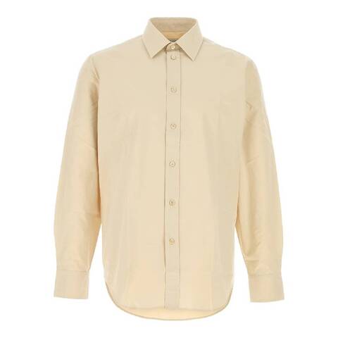Burberry Mens Tops. SKU: 8089485. Barcode: 5045706345005. Color: Sand. Size: Medium. Burberry Signature Equestrian Knight Motif Cotton Shirt. This shirt features a button-down open design with a pointed collar, double-button cuffs, and a curved hem, while the front is beautifully embellished with Equestrian Knight Logo (EKD) embroidery, adding a touch of refined elegance to its classic silhouette. 100% Cotton.