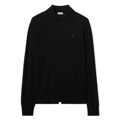 Burberry Mens Tops. Fashion category: Polo Shirts. SKU: 8104874. Color: Black. Burberry Logo Embroidered Long-Sleeved Polo Shirt. This polo shirt features a classic collar with a three-button placket, long sleeves, and ribbed cuffs and hem. It is finished with a B-shaped shield embroidered logo on the left chest. 100% Wool.