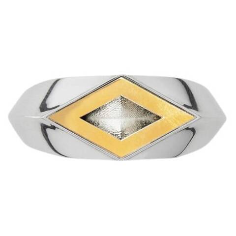 Burberry Ladies Rings. SKU: 8078955. Color: Silver/Gold. Burberry Silver and Gold-plated Hollow Ring. This sterling silver ring is elevated with a striking gold-plated hollow cutout, creating a refined contrast of tones and textures. Expertly crafted, it is finished with an engraved rose hallmark at the inner band, reflecting attention to detail and timeless craftsmanship. 100% sterling silver with gold plating. Made in Italy.