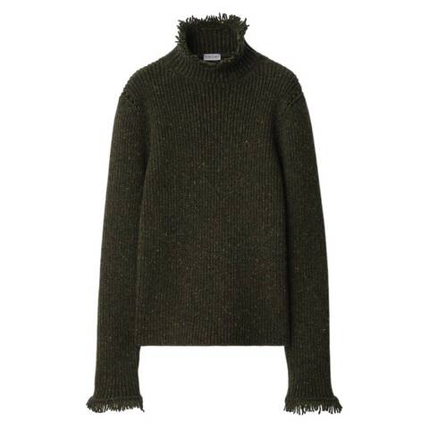 Burberry Ladies Tops. Fashion category: Cardigans & Sweaters. SKU: 8098792. Color: Glen. Burberry Fringed Rib-Knit Wool Sweater. This rib-knit sweater is crafted in Italy from flecked wool and designed in a heavyweight, regular-fit silhouette. It features long sleeves and is finished with delicate fringing at the high neckline and cuffs. 100% wool. Made in Italy.