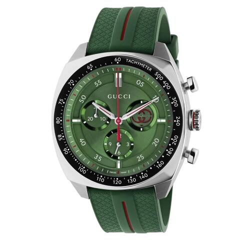 Silver-tone stainless steel case with a green rubber strap. Fixed silver-tone stainless steel bezel. Green dial with silver-tone hands and index hour markers. Minute markers around the outer rim. Dial Type: Analog. Quartz movement. Scratch resistant sapphire crystal. Pull / push crown. Round case shape, case size: 41 mm. Band width: 22 mm, band length: 7.5 inches. Buckle clasp. Water resistant at 100 meters / 330 feet. Functions: chronograph, hour, minute, second. Gucci Interlocking Series. Fashion watch style. Watch label: Swiss Made. Gucci Gucci Interlocking Chronograph Quartz Green Dial Mens Watch YA142319.