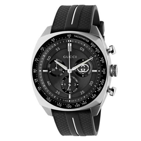 Silver-tone stainless steel case with a black rubber strap. Fixed silver-tone stainless steel bezel. Black dial with silver-tone hands and index hour markers. Minute markers around the outer rim. Dial Type: Analog. Quartz movement. Scratch resistant sapphire crystal. Pull / push crown. Cushion case shape, case size: 41 mm. Band width: 22 mm, band length: 7.5 inches. Buckle clasp. Water resistant at 100 meters / 330 feet. Functions: chronograph, hour, minute, second. Gucci Interlocking Series. Fashion watch style. Watch label: Swiss Made. Gucci Gucci Interlocking Chronograph Quartz Black Dial Mens Watch YA142320.