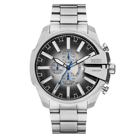 Silver-tone stainless steel case and bracelet. Fixed silver-tone stainless steel bezel. Black dial with black hands and index hour markers. Minute markers around the outer rim. Dial Type: Analog. Luminescent hands and markers. Date display at the 3 o'clock position. Quartz movement. Scratch resistant mineral crystal. Pull / push crown. Round case shape, case size: 48 mm. Band width: 24 mm, band length: 7.5 inches. Fold over clasp. Water resistant at 50 meters / 165 feet. Functions: chronograph, date, hour, minute, second. Mega Series. Fashion watch style. Diesel Mega Black Dial Mens Watch DZ4686.