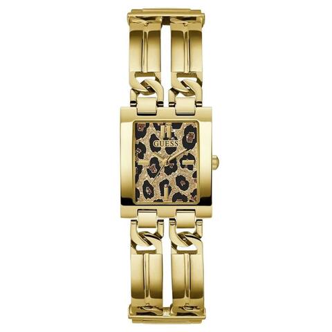 Yellow gold-tone stainless steel case and bracelet. Fixed yellow gold-tone stainless steel bezel. Gold-tone dial with yellow gold-tone hands and index hour markers. Dial Type: Analog. Quartz movement. Scratch resistant mineral crystal. Pull / push crown. Square case shape, case size: 24 mm. Band width: 19 mm, band length: 7.5 inches. Fold over clasp. Water resistant at 30 meters / 100 feet. Functions: hour, minute, second. Mod Id Series. Fashion watch style. Guess Mod Id Quartz Gold Dial Ladies Watch GW0807L2.