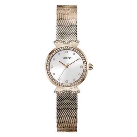 Rose gold-tone stainless steel case and bracelet. Fixed rose gold-tone stainless steel bezel. White dial with rose gold-tone hands and index hour markers. Dial Type: Analog. Quartz movement. Scratch resistant mineral crystal. Pull / push crown. Round case shape, case size: 28 mm. Band width: 14 mm, band length: 7.5 inches. Jewelry clasp. Water resistant at 30 meters / 100 feet. Functions: hour, minute, second. Mermaid Series. Fashion watch style. Guess Mermaid Quartz White Dial Ladies Watch GW0866L2.