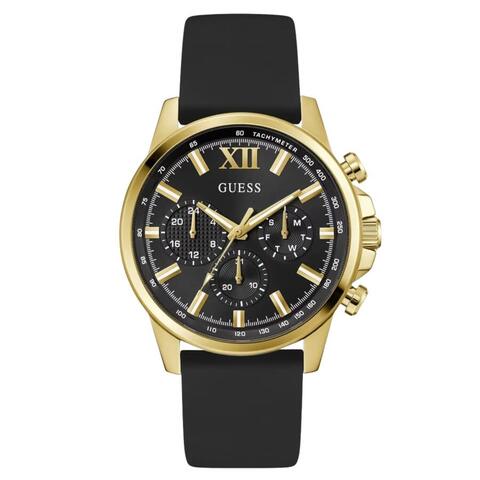 Yellow gold-tone stainless steel case with a black silicone strap. Fixed yellow gold-tone stainless steel bezel. Black dial with yellow gold-tone hands and index hour markers. Minute markers around the outer rim. Dial Type: Analog. Luminescent hands and markers. Quartz movement. Scratch resistant mineral crystal. Pull / push crown. Round case shape, case size: 44 mm. Band width: 22 mm, band length: 7.5 inches. Buckle clasp. Water resistant at 50 meters / 165 feet. Functions: date, day, hour, minute, second. Walker Series. Fashion watch style. Guess Walker Quartz Black Dial Mens Watch GW0913G2.