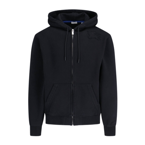 Burberry Mens Tops. Fashion category: Hoodies & Sweatshirts. SKU: 8094617. Color: Navy. Burberry Equestrian Knight Patch Zip Hoodie. This zip-up hoodie is crafted from heavyweight cotton jersey and cut to a relaxed fit for everyday comfort. It features a front zip closure, practical pouch pockets, and rib-knit trims, and is finished with a tonal applique of the iconic Equestrian Knight Design. 100% Cotton. Made in Portugal.