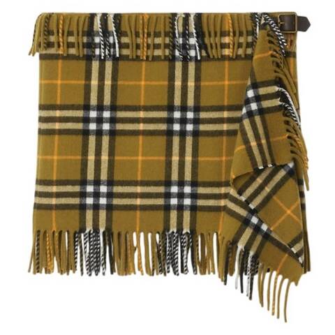 Burberry Ladies Bottoms. Fashion category: Skirts. SKU: 8099716. Color: Oxide. Burberry Check Fringed Mini Scarf Skirt. This skirt is crafted in Italy from a luxurious wool-cashmere blend woven with the iconic Burberry Check. Inspired by the houses Happy scarf, the design is finished with delicate fringing along the edges and features a leather strap to adjust the fit. A side button and signature B buckle closure complete the look with refined detailing. 85% Wool; 15% Cashmere