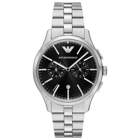 Silver-tone stainless steel case and bracelet. Fixed silver-tone stainless steel bezel. Black dial with silver-tone hands and index hour markers. Minute markers around the outer rim. Dial Type: Analog. Luminescent hands and markers. Date display at the 6 o'clock position. Quartz movement. Scratch resistant mineral crystal. Pull / push crown. Round case shape, case size: 42 mm. Band width: 20 mm, band length: 7.5 inches. Fold over clasp. Water resistant at 50 meters / 165 feet. Functions: chronograph, date, hour, minute, second. Dario Series. Fashion watch style. Emporio Armani Dario Black Dial Mens Watch AR11691.