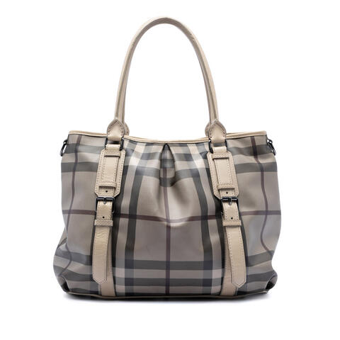 The Burberry Smoke Check Coated Canvas Northfield Satchel is a timeless designer handbag that blends iconic style with practical elegance. Crafted from durable plaid coated canvas with leather trim and refined buckle details, this satchel offers rolled leather handles, a magnetic snap button closure, and interior zip pockets for organized storage. Its classic silhouette and signature Burberry design make it a standout accessory for anyone seeking luxury and contemporary style.<br /><br /> Designed for both fashion and functionality, this Burberry Northfield Satchel offers a spacious interior and versatile structure that makes it easy to carry your daily essentials in style. The open top with magnetic snap closure allows convenient access, while the interior zip pockets help keep smaller items secure and organized. Whether paired with casual looks or more polished outfits, this designer satchel is perfect for everyday use.<br /><br /> This pre-owned Burberry Smoke Check Coated Canvas Northfield Satchel measures approximately 12.99 x 14.76 x 5.71 inches and is rated B+ condition. Comments: Exterior Back Worn, Stained With Others, Creased. Exterior Bottom Scratched, Worn, Stained With Others. Exterior Corners Worn, Stained With Others. Exterior Front Stained With Others, Worn, Scratched, Creased. Exterior Handle/Strap Cracked, Scratched, Stained With Others, Cut Stitching. Exterior Side Worn, Stained With Others. Exterior Top Stained With Others, Worn. Hardware Closure Scratched, Rusty/Tarnished. Hardware Practical Attachment Scratched. Zipper Scratched. Interior Lining Stained With Others. Interior Pocket Stained With Others. Inclusions: None. Model: Smoke Check Coated Canvas Northfield Satchel. Item# 4UVNHULUOATCN6TV. This is a great opportunity to own an authentic handbag at a more accessible price.