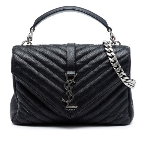 The Saint Laurent Medium Chevron Embossed Leather Monogram College Satchel is a timeless designer handbag that blends iconic detailing with refined everyday appeal. Crafted from embossed leather, this elegant satchel features the signature Monogram design, a rolled leather top handle, and a detachable curb chain shoulder strap with a leather guard for versatile styling. Its structured silhouette and sophisticated finish make it a standout choice for anyone seeking luxury and contemporary style.<br /><br /> Designed for both fashion and functionality, this Saint Laurent College satchel offers a front flap with magnetic snap closure, an interior back slip pocket, and an interior zip pocket to help keep essentials organized throughout the day. The compact yet practical size, measuring 6.69 x 9.06 x 2.76 inches, makes it easy to carry while still offering room for your daily necessities, making it perfect for everyday use.<br /><br /> This pre-owned Saint Laurent handbag includes the shoulder strap and is identified as Model: Medium Chevron Embossed Leather Monogram College Satchel, Item# ZZL43PRPWPCA1V1V. Condition Rating: B+. Comments: Exterior Pocket Stained With Others. Interior Lining Stained With Others. Hardware Closure Scratched. Exterior Front Repainted. Hardware Practical Attachment Scratched. Exterior Handle/Strap Stained With Others. Exterior Side Stained With Others. Exterior Back Worn. Interior Pocket Stained With Others. Exterior Bottom Stained With Others. Zipper Scratched. Exterior front has been repainted. This is a great opportunity to own an authentic handbag at a more accessible price.