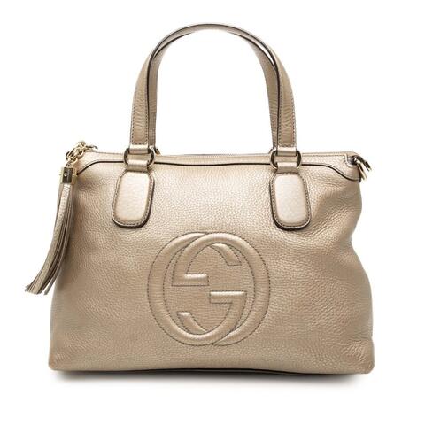 The pre-owned Gucci Small Metallic Leather Soho Working Satchel is a chic and versatile handbag that blends signature designer appeal with everyday practicality. Crafted from metallic leather, this stylish satchel features flat leather handles, a secure top zip closure, and multiple interior zip and slip pockets to help keep your essentials organized. Its compact yet functional size makes it an elegant choice for day-to-day wear, offering luxury and contemporary style.<br /><br /> Designed for both fashion and functionality, this Gucci Soho Working Satchel is an excellent option for anyone seeking a refined handbag that complements both casual and polished looks. The metallic finish adds a modern touch, while the thoughtfully designed interior provides convenient storage for your daily necessities, making it perfect for everyday use.<br /><br /> This authentic pre-owned Gucci handbag measures approximately 8.27 inches high x 12.60 inches wide x 5.91 inches deep. Condition Rating: B+. Pre-owned condition details: Exterior Back Stained With Others. Exterior Corners Worn. Exterior Front Scratched. Exterior Handle/Strap Discolored. Exterior Top Cracked. Hardware Practical Attachment Scratched. Zipper Scratched, Rusty/Tarnished. Interior Lining Stained With Others, Discolored. Interior Pocket Stained With Others, Discolored. Inclusions: None. Model: Small Metallic Leather Soho Working Satchel. Item# 0AVPEZAB3GO388VY. This is a great opportunity to own an authentic handbag at a more accessible price.