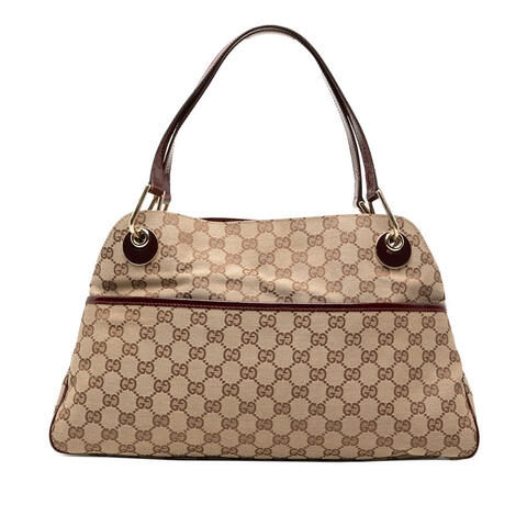 The pre-owned Gucci GG Canvas Eclipse Shoulder Bag is a stylish designer handbag that blends iconic branding with everyday versatility. Crafted with a durable canvas body and refined leather trim, this Gucci tote features flat leather handles, an open top with a magnetic closure, an exterior front slip pocket, and interior zip and slip pockets for organized storage. With dimensions of 9.45 x 15.35 x 2.76 inches, it offers a sleek yet practical silhouette that reflects luxury and contemporary style.<br /><br /> Designed for both fashion and functionality, this authentic Gucci shoulder bag is an excellent choice for carrying your daily essentials with ease. The combination of signature GG canvas, leather detailing, and multiple pockets makes it a smart addition to any wardrobe, whether for work, errands, or casual outings. Its timeless design and practical layout make it perfect for everyday use.<br /><br /> This Gucci GG Canvas Eclipse Shoulder Bag is rated Condition B and is being sold as a pre-owned item. Comments: Interior Pocket Stained With Others. Exterior Handle/Strap Worn, Stained With Others, Creased. Exterior Top Stained With Others. Hardware Practical Attachment Scratched. Exterior Bottom Stained With Others. Zipper Scratched. Interior Lining Stained With Others, Cut Stitching. Hardware Closure Scratched. Exterior Pocket Stained With Others. Exterior Back Stained With Others, Peeling. Exterior Front Stained With Others, Peeling, Cut Stitching. Exterior Corners Worn. Inclusions: None. Model: GG Canvas Eclipse Shoulder Bag. Item# 5R0QL84LBR8VH0H7. This is a great opportunity to own an authentic handbag at a more accessible price.