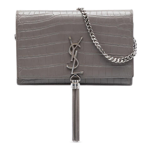The pre-owned Saint Laurent Croc Embossed Leather Monogram Kate Tassel Wallet on Chain is a chic designer accessory that combines timeless elegance with versatile wearability. Crafted from croc-embossed leather and finished with the iconic Saint Laurent monogram, this wallet on chain offers a sophisticated look that easily transitions from day to evening. Its sleek silhouette and refined details make it an excellent choice for anyone seeking luxury and contemporary style.<br /><br /> Designed for both fashion and functionality, this Saint Laurent Kate wallet on chain features a detachable chain-link shoulder strap with a leather guard, a front flap with magnetic snap closure, and thoughtfully organized interior zip and slip pockets. Compact yet practical, it measures approximately 5.12 inches high, 7.48 inches wide, and 1.57 inches deep, making it ideal for carrying your essentials while maintaining a polished, streamlined profile perfect for everyday use.<br /><br /> This authentic pre-owned Saint Laurent handbag is model Croc Embossed Leather Monogram Kate Tassel Wallet on Chain, Item# D7Z1FMFESGY61ZYW. Condition Rating: B+. Comments: Exterior Back Stained With Others. Exterior Bottom Stained With Others. Exterior Corners Worn. Exterior Front Stained With Others. Exterior Handle/Strap Worn. Exterior Top Scratched. Hardware Closure Scratched. Hardware Practical Attachment Scratched. Zipper Scratched. Interior Lining Stained With Others. Interior Pocket Stained With Others. Inclusions: None. This is a great opportunity to own an authentic handbag at a more accessible price.