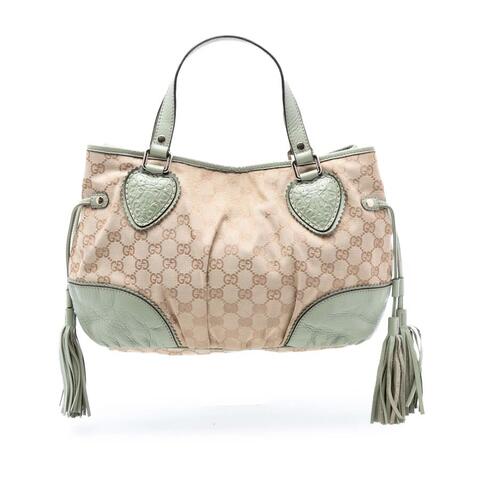 The Gucci Small GG Canvas Tribeca Tote is a timeless designer handbag that blends signature elegance with practical appeal. Crafted with the iconic GG canvas, leather trim, and stylish side tassel details, this tote offers a refined look that easily complements a wide range of wardrobes. Flat leather straps, an open top with a magnetic snap closure, and a well-organized interior with zip and slip pockets make it a standout choice for anyone seeking luxury and contemporary style.<br /><br /> Designed for both fashion and functionality, this Gucci tote is ideal for carrying your daily essentials while maintaining a polished, sophisticated appearance. Its compact yet practical dimensions of 9.06 x 10.63 x 4.33 inches make it a versatile accessory for work, shopping, lunch dates, or casual outings. With its classic silhouette and recognizable designer details, this bag is perfect for everyday use.<br /><br /> This pre-owned Gucci Small GG Canvas Tribeca Tote, model Small GG Canvas Tribeca Tote, Item# 6N6Z3OL6F5HQPEV8, is a desirable option for collectors and fashion lovers looking for authentic Gucci at a better value. Condition Rating: B+. Comments: Exterior Back Creased, Worn, Stained With Others. Exterior Bottom Stained With Others. Exterior Corners Worn. Exterior Front Stained With Others, Worn, Creased. Exterior Handle/Strap Stained With Others, Creased. Exterior Side Stained With Others. Exterior Top Worn. Hardware Closure Scratched. Hardware Practical Attachment Scratched. Zipper Scratched. Interior Lining Loose Stiching, Stained With Others. Inclusions: None. This is a great opportunity to own an authentic handbag at a more accessible price.