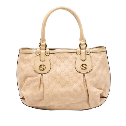 The Gucci Guccissima Scarlett Tote is a timeless designer handbag crafted from luxurious leather, featuring elegant rolled leather handles, a convenient open top with a magnetic snap closure, and thoughtfully designed interior zip and slip pockets. With dimensions of 10.24 x 15.35 x 3.94 inches, this tote offers a sleek yet spacious silhouette that makes it an ideal choice for carrying your daily essentials in refined fashion. Its iconic design makes it a standout accessory for anyone seeking luxury and contemporary style.<br /><br /> Designed for both fashion and functionality, this pre-owned Gucci Scarlett Tote combines sophisticated craftsmanship with practical storage, making it a versatile addition to any wardrobe. The roomy interior and organized pockets help keep your belongings secure and accessible, while the classic Gucci aesthetic adds polished appeal to both casual and elevated looks. This designer tote is an excellent choice for work, errands, or daily outings, making it perfect for everyday use.<br /><br /> This pre-owned Gucci ssima Scarlett Tote, Model: Guccissima Scarlett Tote, Item# VB5MHVO1HBVK3Y87, is rated AB. Condition Rating: AB. Comments: Exterior Back Stained With Others. Exterior Corners Worn. Exterior Front Stained With Others. Exterior Handle/Strap Stained With Others. Exterior Side Stained With Others. Hardware Practical Attachment Scratched. Zipper Scratched. Interior Lining Stained With Others. Interior Pocket Stained With Others. Inclusions: None. This is a great opportunity to own an authentic handbag at a more accessible price.