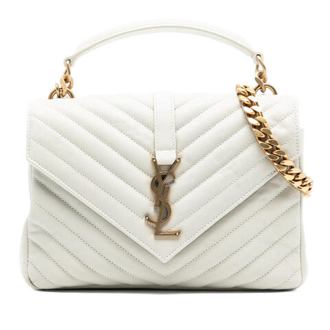 The pre-owned Saint Laurent Medium Chevron Sheepskin Monogram College Satchel is a timeless designer handbag that blends iconic craftsmanship with everyday elegance. Crafted from soft chevron-quilted sheepskin leather, this medium satchel features a structured silhouette, a rolled leather top handle, a detachable curb chain shoulder strap with leather guard, and the signature front flap with magnetic snap closure. Inside, it offers a convenient back slip pocket and zip pocket to help keep essentials organized, making it a refined choice for anyone seeking luxury and contemporary style. <br /><br /> Designed for both fashion and functionality, this Saint Laurent College satchel is a versatile accessory that transitions effortlessly from day to evening. Its compact yet practical size, measuring 6.89 x 9.25 x 2.17 inches, makes it ideal for carrying daily essentials while maintaining a polished, sophisticated look. The included dust bag and shoulder strap add extra value and convenience, making this designer handbag perfect for everyday use. <br /><br /> This authentic Saint Laurent Medium Chevron Sheepskin Monogram College Satchel, model Item# JZCDZU0VIZEREK8N, is offered in pre-owned condition with a Condition Rating of B+. Handle has been repainted. Comments: Exterior Back Stained With Others, Worn. Exterior Bottom Worn. Exterior Front Scratched. Exterior Handle/Strap Repainted, Creased. Exterior Side Stained With Others, Worn. Hardware Closure Scratched. Hardware Embellishment Scratched. Hardware Practical Attachment Scratched. Zipper Scratched. Interior Lining Stained With Others, Scratched. Inclusions: Dust bag, Shoulder Strap. This is a great opportunity to own an authentic handbag at a more accessible price.