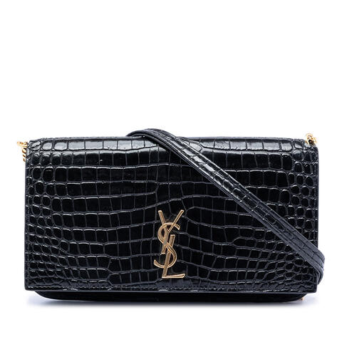 The Saint Laurent Croc Embossed Leather Cassandre Phone Holder is a chic and practical accessory crafted from embossed calf leather for a refined, elevated look. Featuring the iconic Cassandre design, this elegant phone holder includes a curb chain link strap with a leather guard, a secure front flap with snap button closure, and an exterior back slip pocket for added convenience. Its compact silhouette and sophisticated finish make it an ideal choice for carrying essentials with luxury and contemporary style. <br /><br /> Designed for both fashion and functionality, this pre-owned Saint Laurent phone holder offers a smart way to keep your phone and small necessities close at hand while maintaining a polished designer look. Measuring approximately 4.33 inches high, 6.89 inches wide, and 0.79 inches deep, it is perfectly sized for streamlined carrying whether you're out for the day or heading into the evening. The versatile chain strap and practical pocket details make it perfect for everyday use. <br /><br /> This pre-owned Saint Laurent Croc Embossed Leather Cassandre Phone Holder is a stylish option for luxury lovers seeking timeless designer appeal at a better value. Model: Croc Embossed Leather Cassandre Phone Holder. Item#: 648ZSXJAQ0CXZFG5. Inclusions: None. Condition Rating: AB. Conditions for pre-owned: Exterior Front Scratched. Exterior Pocket Worn, Stained With Others. Exterior Top Scratched. Hardware Closure Scratched. Hardware Practical Attachment Scratched. Interior Lining Worn, Stained With Others. This is a great opportunity to own an authentic handbag at a more accessible price.