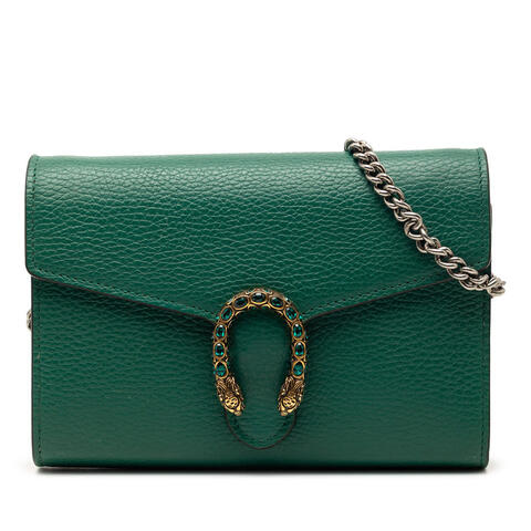Pre-owned Gucci Leather Dionysus Wallet on Chain crafted from premium leather, featuring the iconic chain link shoulder strap and signature front flap with snap button closure. This elegant designer handbag offers a compact yet refined silhouette, making it an ideal choice for day-to-evening wear with luxury and contemporary style.<br /><br /> Designed for both fashion and functionality, this Gucci Dionysus Wallet on Chain includes thoughtfully organized interior zip and slip pockets to keep your essentials secure and easily accessible. With dimensions of 5.91 x 7.87 x 1.38 inches, it is a chic and versatile accessory that is perfect for everyday use.<br /><br /> This authentic pre-owned Gucci handbag is a stylish option for collectors and fashion lovers seeking timeless designer appeal. Condition Rating: B+. Pre-owned condition details: Exterior back stained with others; exterior corners worn; exterior front stained with others; exterior side cut stitching and stained with others; hardware closure scratched; hardware embellishment scratched and rusty/tarnished; hardware practical attachment scratched; zipper scratched; interior lining stained with others; interior pocket stained with others. Inclusions: None. Model: Leather Dionysus Wallet on Chain. Item# MCNFM6HAWOJS5SKG. This is a great opportunity to own an authentic handbag at a more accessible price.