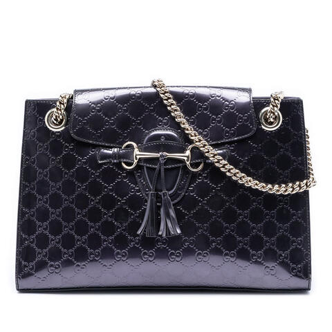 The Gucci Large Patent Guccissima Emily Shoulder Bag is a sophisticated designer handbag that blends iconic elegance with practical appeal. Crafted from glossy patent leather, this statement piece features silver-tone chain link straps with flat leather shoulder guards, a front flap with slip-through closure, and interior zip and slip pockets for organized storage. With dimensions of 10.04 x 14.17 x 3.94 inches, it offers a polished silhouette that elevates any wardrobe with luxury and contemporary style. <br /><br /> Designed for both fashion and functionality, this pre-owned Gucci Emily shoulder bag is spacious enough to carry your daily essentials while maintaining a chic, refined look. The sleek patent leather finish, signature Guccissima design, and versatile shoulder style make it an excellent choice for work, shopping, dining, or casual outings. Its combination of designer craftsmanship and timeless style makes it perfect for everyday use. <br /><br /> This authentic pre-owned Gucci handbag is a smart choice for buyers seeking premium designer style at a better value. Condition Rating: B+. Comments: Exterior Back Stained With Others, Creased, Scratched. Exterior Bottom Stained With Others, Creased. Exterior Corners Worn, Cracked. Exterior Front Creased, Stained With Others, Scratched. Exterior Handle/Strap Creased. Exterior Side Cracked. Exterior Top Scratched. Hardware Practical Attachment Scratched. Zipper Scratched. Interior Lining Scratched, Stained With Others. Inclusions: None. Model: Large Patent Guccissima Emily Shoulder Bag. Item# FXNY12XEY2730N0P. This is a great opportunity to own an authentic handbag at a more accessible price.