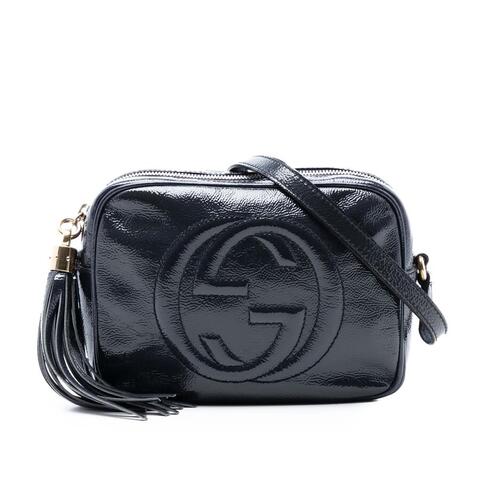 The Gucci Patent Soho Disco Crossbody is a chic and timeless designer handbag crafted from glossy patent leather with signature tassel detailing. Its compact silhouette is paired with an adjustable flat leather strap, making it easy to wear comfortably throughout the day while adding a polished statement to any outfit. With its elegant design and iconic Gucci appeal, this bag is a beautiful blend of luxury and contemporary style.<br /><br /> Designed for both fashion and functionality, this crossbody features a secure top zip closure and interior slip pockets to help keep your essentials organized. Measuring approximately 6.10 inches high, 7.87 inches wide, and 2.76 inches deep, it offers a practical size for carrying daily necessities without feeling bulky. This versatile Gucci handbag is stylish, easy to pair with a variety of looks, and perfect for everyday use.<br /><br /> Pre-owned Gucci Patent Soho Disco Crossbody Ladies 8RAP6NKQGY8BIYXV. Model: Patent Soho Disco Crossbody. Dimensions (in): 6.10 x 7.87 x 2.76. Inclusions: None. Condition Rating: AB. Comments: Exterior Back Stained With Others. Exterior Bottom Stained With Others. Exterior Corners Worn. Exterior Handle/Strap Creased, Stained With Others, Worn. Exterior Side Stained With Others. Hardware Practical Attachment Scratched. Zipper Scratched. Interior Lining Stained With Others. Interior Pocket Stained With Others. This is a great opportunity to own an authentic handbag at a more accessible price.