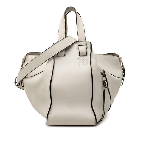 The Loewe Small Leather Hammock Satchel is a sophisticated designer handbag crafted from premium leather with a distinctive modern silhouette. Featuring flat leather handles, a detachable flat leather strap, an open top, exterior zip pockets, and interior slip pockets, this elegant bag offers both style and versatility in a compact size of 9.45 x 10.63 x 5.31 inches. Its unique shape and refined details make it an excellent choice for anyone seeking luxury and contemporary style. <br /><br /> Designed for both fashion and functionality, this pre-owned Loewe Hammock Satchel is ideal for organizing your essentials while elevating your everyday wardrobe. The thoughtful combination of exterior zip pockets and interior slip pockets provides convenient storage, while the structured leather design maintains its polished appeal. Complete with a shoulder strap and dust bag, this authentic Loewe handbag is perfect for everyday use. <br /><br /> This pre-owned Loewe Small Leather Hammock Satchel has a Condition Rating of B+ and remains a stylish and desirable luxury accessory. Comments: Exterior Back Scratched. Exterior Bottom Worn, Stained With Others. Exterior Corners Worn. Exterior Front Scratched, Stained With Others. Exterior Handle/Strap Creased, Worn, Stained With Others. Exterior Side Stained With Others, Scratched. Exterior Top Worn. Hardware Closure Scratched. Hardware Practical Attachment Scratched. Zipper Scratched. Model: Small Leather Hammock Satchel. Item# 537VMLCP6GCJFJCY. This is a great opportunity to own an authentic handbag at a more accessible price.