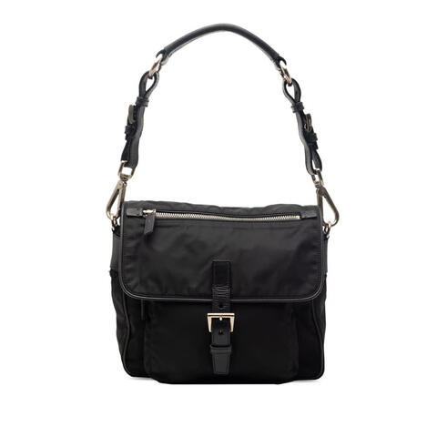 The Prada Saffiano Trimmed Tessuto Shoulder Bag is a chic and versatile designer accessory crafted from durable nylon with refined leather trim. It features a detachable flat leather strap, a stylish front flap with belt buckle closure, an exterior zip pocket, and an interior zip pocket for added convenience. With dimensions of 8.66 x 9.06 x 3.54 inches, this compact yet functional handbag is an elegant choice for anyone seeking luxury and contemporary style.<br /><br /> Designed for both fashion and functionality, this Prada shoulder bag offers a practical layout that makes organizing essentials simple and effortless. The combination of lightweight tessuto nylon and signature saffiano leather trim creates a timeless look that pairs beautifully with both casual and polished outfits. Its compact size, secure closure, and multiple pockets make it perfect for everyday use.<br /><br /> As a pre-owned authentic Prada handbag, this piece includes an authenticity card and offers a smart way to enjoy designer fashion at a better value. Condition Rating: B+. Pre-owned condition details include scratches and wear on the exterior back, bottom, corners, side, and hardware; staining on the exterior front, top, handle/strap, interior lining, and interior pocket; cracking and additional wear on the handle/strap; and rusty/tarnished areas on the closure, practical attachment, and zipper. Model: Saffiano Trimmed Tessuto Shoulder Bag. Item# KUDRP0BIN8XIF827. This is a great opportunity to own an authentic handbag at a more accessible price.