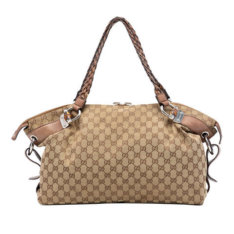 Pre-owned Gucci Medium GG Canvas Bamboo Bar Tote Ladies W4DS16K70J5NBLQN is a timeless designer handbag that blends iconic appeal with everyday versatility. Crafted with Guccis signature GG canvas and refined leather trim, this elegant tote features braided leather straps, a secure top zip closure, and a spacious interior with zip and slip pockets for easy organization. Its classic silhouette and instantly recognizable design make it a standout accessory that reflects luxury and contemporary style.<br /><br /> Designed for both fashion and functionality, this Gucci Medium GG Canvas Bamboo Bar Tote offers generous space for daily essentials while maintaining a polished, sophisticated look. Measuring approximately 11.02 x 16.14 x 6.10 inches, it is ideal for carrying everything from your wallet and phone to small personal items with ease, making it perfect for everyday use.<br /><br /> This authentic pre-owned Gucci tote is a smart choice for shoppers seeking designer style at a better value. Condition Rating: B+. Comments: Exterior Back Stained With Others. Exterior Bottom Stained With Others. Exterior Corners Stained With Others, Worn. Exterior Front Stained With Others. Exterior Handle/Strap Stained With Others, Split, Worn. Exterior Side Stained With Others. Hardware Practical Attachment Scratched. Zipper Scratched. Interior Lining Stained With Others, Worn. Inclusions: None. This is a great opportunity to own an authentic handbag at a more accessible price.
