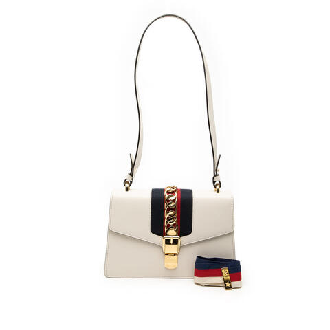 The Gucci Small Leather Sylvie Web Satchel is a timeless designer handbag that blends iconic craftsmanship with everyday elegance. Crafted with a structured leather body, this chic satchel features a flat leather handle, a detachable flat canvas strap, a front flap with push lock closure, and an interior slip pocket for easy organization. With dimensions of 6.50 x 10.04 x 2.95 inches, this compact yet stylish silhouette is ideal for carrying your essentials with luxury and contemporary style.<br /><br /> Designed for both fashion and functionality, this pre-owned Gucci Sylvie satchel offers versatile wear with its top handle and included shoulder strap, making it easy to transition from day to evening. The signature design and refined structure make it a standout choice for anyone searching for an authentic Gucci handbag that combines sophistication, practicality, and designer appeal, perfect for everyday use.<br /><br /> This pre-owned Gucci Small Leather Sylvie Web Satchel includes the Shoulder Strap and is identified as Model: Small Leather Sylvie Web Satchel, Item# A1INFGC87MXGZYDR. Condition Rating: B+. Comments: Hardware Closure Scratched. Exterior Side Scratched. Interior Lining Stained With Others, Scratched. Hardware Embellishment Scratched. Exterior Front Scratched. Exterior Corners Worn. Hardware Practical Attachment Scratched. Zipper Scratched. Exterior Back Scratched. Exterior Bottom Scratched. Exterior Handle/Strap Creased, Stained With Others, Scratched. Exterior Top Stained With Others, Scratched. This is a great opportunity to own an authentic handbag at a more accessible price.