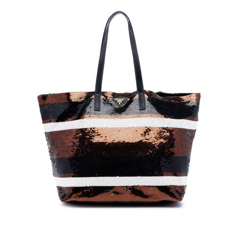 The Prada Sequined Satin Stripes Tote is a striking designer handbag that blends glamorous texture with practical sophistication. Crafted with a sequined satin body, flat leather handles, and a spacious open-top silhouette, this tote offers standout appeal while remaining easy to carry throughout the day. Its elegant striped design and refined construction make it a beautiful choice for anyone seeking luxury and contemporary style.<br /><br /> Designed for both fashion and functionality, this pre-owned Prada tote features a roomy interior with a convenient zip pocket to help keep essentials organized. Measuring approximately 12.99 inches high x 14.17 inches wide x 7.48 inches deep, it offers generous space for daily necessities, making it a stylish and practical handbag for work, shopping, or casual outings. With its eye-catching sequined finish and comfortable leather handles, it is perfect for everyday use.<br /><br /> This tote bag features a sequined satin body, flat leather handles, an open top, and an interior zip pocket. Model: Sequined Satin Stripes Tote. Item# V73KT62MBUYUYL3K. Inclusions: None. Condition Rating: B+. Comments: Exterior Front Worn. Hardware Embellishment Missing. Zipper Scratched. This pre-owned Prada handbag is a smart choice for shoppers looking for authentic designer style with value, and this is a great opportunity to own an authentic handbag at a more accessible price.