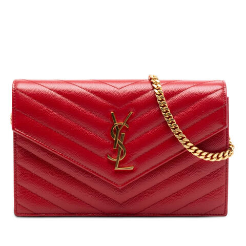 The Saint Laurent Grain De Poudre Chevron Monogram Envelope Wallet on Chain is a refined designer crossbody that blends elegance with practicality. Crafted with a leather body, this chic handbag features a curb chain link strap with a leather guard, a front flap with snap fastener button closure, an interior zip compartment, and an open compartment with convenient card slots. With compact dimensions of 4.72 x 7.48 x 1.18 inches, it is an ideal choice for carrying your essentials in luxury and contemporary style.<br /><br /> Designed for both fashion and functionality, this pre-owned Saint Laurent wallet on chain is a versatile accessory that transitions effortlessly from day to evening. The signature chevron detailing and iconic monogram design give it timeless appeal, while the organized interior makes it easy to keep your small essentials secure and accessible. Whether styled as a crossbody or carried for special occasions, it is perfect for everyday use.<br /><br /> This authentic pre-owned Saint Laurent Grain De Poudre Chevron Monogram Envelope Wallet on Chain, Model: Grain De Poudre Chevron Monogram Envelope Wallet on Chain, Item# 5U9UCZR4UCU0KKXE, offers designer sophistication at a more attainable value. Condition Rating: B+. Comments: Exterior Back Creased, Stained With Others. Exterior Bottom Stained With Others. Exterior Corners Worn, Stained With Others. Exterior Front Worn. Exterior Handle/Strap Stained With Others, Creased. Exterior Side Stained With Others. Hardware Closure Scratched. Hardware Embellishment Scratched. Hardware Practical Attachment Scratched. Zipper Scratched. Interior Lining Stained With Others, Scratched. Inclusions: None. This is a great opportunity to own an authentic handbag at a more accessible price.