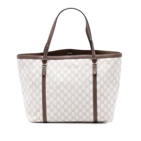 The Gucci GG Supreme Nice Tote is a sophisticated pre-owned handbag that blends iconic design with everyday versatility. Crafted with a durable coated canvas body and refined leather trim, this elegant tote features flat leather straps, an open top with a lobster clasp closure, and a spacious interior with both zip and slip pockets for effortless organization. Its timeless silhouette and signature Gucci appeal make it an exceptional choice for anyone seeking luxury and contemporary style.<br /><br /> Designed for both fashion and functionality, this Gucci Nice Tote offers the ideal balance of style and practicality. Measuring approximately 11.02 x 13.39 x 5.91 inches, it provides ample space for daily essentials while maintaining a sleek, polished look. Whether you're heading to work, shopping, or meeting friends, this authentic Gucci handbag is a versatile accessory that is perfect for everyday use.<br /><br /> This pre-owned Gucci GG Supreme Nice Tote is a smart choice for shoppers looking for designer quality at a more attainable value. Model: GG Supreme Nice Tote. Item# JPDBPFEJ5DDCIQUP. Inclusions: None. Condition Rating: AB. Comments: Exterior Corners Worn. Exterior Front Creased. Exterior Handle/Strap Out of Shape, Worn. Hardware Practical Attachment Scratched. Zipper Scratched. Interior Lining Stained With Others. This is a great opportunity to own an authentic handbag at a more accessible price.