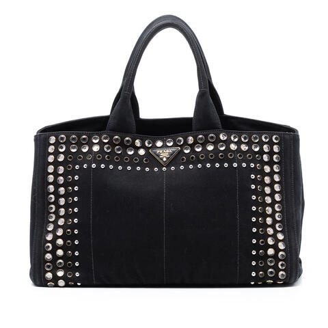 The Prada Large Canvas Canapa Bijoux Satchel is a chic and versatile handbag that blends iconic designer appeal with everyday practicality. Crafted from durable canvas and accented with striking studded details, this satchel offers a stylish statement while maintaining the spacious structure shoppers love. Rolled top handles, an open top, and interior zip and slip pockets make it easy to carry and organize your essentials with luxury and contemporary style.<br /><br /> Designed for both fashion and functionality, this pre-owned Prada satchel features a roomy silhouette with dimensions of 9.65 x 15.35 x 9.65 inches, making it ideal for carrying daily necessities with ease. The canvas construction adds durability, while the embellished bijoux detailing gives it a distinctive designer edge that stands out in any wardrobe. Whether paired with casual looks or elevated ensembles, this Prada handbag is perfect for everyday use.<br /><br /> Condition Rating: B+. Comments: Exterior Back Stained With Others. Exterior Corners Worn. Exterior Handle/Strap Worn. Exterior Side Worn. Exterior Top Worn. Hardware Closure Scratched. Hardware Practical Attachment Scratched. Zipper Scratched. Interior Lining Stained With Others. Inclusions: None. Model: Large Canvas Canapa Bijoux Satchel. Item# LU8E904S1XSILFS0. Pre-owned Prada Large Canvas Canapa Bijoux Satchel Ladies LU8E904S1XSILFS0. This is a great opportunity to own an authentic handbag at a more accessible price.