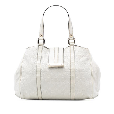 Pre-owned Gucci Guccissima New Ladies Tote crafted in embossed leather with flat leather straps, an open top with a flap tab and magnetic snap closure, and interior zip and slip pockets. This elegant designer handbag offers a spacious silhouette with dimensions of 11.42 x 13.39 x 3.94 inches, making it a stylish and practical choice for daily wear, with a look that blends luxury and contemporary style.<br /><br /> Designed for both fashion and functionality, this Gucci tote features a well-organized interior and a timeless design that complements both casual and polished outfits. The embossed leather finish and signature craftsmanship make it a versatile investment piece for anyone seeking an authentic Gucci handbag that is perfect for everyday use.<br /><br /> This pre-owned Gucci Guccissima New Ladies Tote is a smart choice for shoppers looking for authentic luxury at a better value. Condition Rating: B+. Comments: Exterior Back Stained With Others. Exterior Bottom Stained With Others. Exterior Corners Worn. Exterior Front Worn. Exterior Handle/Strap Cut Stitching. Exterior Top Worn. Hardware Closure Scratched. Hardware Practical Attachment Scratched. Zipper Scratched. Inclusions: None. Model: Guccissima New Ladies Tote. Item# LMVV5UIKGDW917R3. This is a great opportunity to own an authentic handbag at a more accessible price.