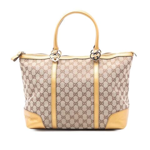 The pre-owned Gucci GG Canvas Lovely Tote is a timeless designer handbag that blends iconic appeal with everyday versatility. Crafted with Guccis signature GG canvas and refined leather trim, this elegant tote features rolled leather handles, a secure top zip closure, and a spacious interior with zip and slip pockets for easy organization. With dimensions of 10.63 x 13.78 x 7.48 inches, it offers a practical size for daily essentials while showcasing luxury and contemporary style.<br /><br /> Designed for both fashion and functionality, this Gucci tote is an excellent choice for women seeking a sophisticated handbag that transitions effortlessly from day to evening. The classic silhouette, recognizable GG canvas, and thoughtfully designed interior make it a stylish and practical companion for work, shopping, or casual outings. Its roomy structure and organized compartments make it perfect for everyday use.<br /><br /> This authentic pre-owned Gucci GG Canvas Lovely Tote is a smart option for buyers who appreciate designer fashion at a better value. Model: GG Canvas Lovely Tote. Item# X2G2DGSFJMOL9VF0. Inclusions: None. Condition Rating: AB. Comments: Zipper Scratched. Interior Lining Creased, Stained With Others. Exterior Front Creased. Exterior Corners Stained With Others, Worn. Hardware Practical Attachment Scratched. Exterior Bottom Scratched. Exterior Back Creased. Exterior Side Creased. This is a great opportunity to own an authentic handbag at a more accessible price.