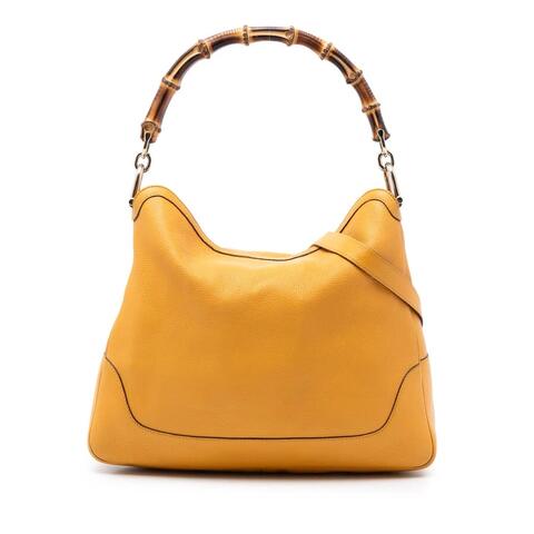 The Gucci Calfskin Bamboo Diana Satchel is a timeless designer handbag that beautifully combines iconic craftsmanship with modern appeal. Crafted from luxurious calfskin leather, this elegant satchel features the signature bamboo handle, a detachable flat leather strap, an open top, and a thoughtfully organized interior with zip and slip pockets. With its spacious silhouette and refined details, this pre-owned Gucci handbag is an excellent choice for anyone seeking luxury and contemporary style.<br /><br /> Designed for both fashion and functionality, this Gucci Bamboo Diana Satchel offers ample room for your daily essentials while maintaining a polished and sophisticated look. The versatile design allows it to be carried by hand or worn with the detachable shoulder strap, making it easy to transition from day to evening. Its classic shape, premium materials, and practical interior compartments make it perfect for everyday use.<br /><br /> This pre-owned Gucci satchel measures approximately 12.20 inches long x 14.96 inches high x 3.74 inches deep and includes the shoulder strap. Condition Rating: B+. Comments: Exterior Front Worn. Exterior Back Worn. Zipper Scratched. Hardware Practical Attachment Scratched. Exterior Side Stained With Others, Stained With Transfer of Color. Exterior Corners Worn, Stained With Others. Exterior Bottom Stained With Others. Exterior Top Worn. Model: Calfskin Bamboo Diana Satchel. Item# 9YNGROZZOLLCI8G6. Pre-owned Gucci Calfskin Bamboo Diana Satchel Ladies 9YNGROZZOLLCI8G6. This is a great opportunity to own an authentic handbag at a more accessible price.